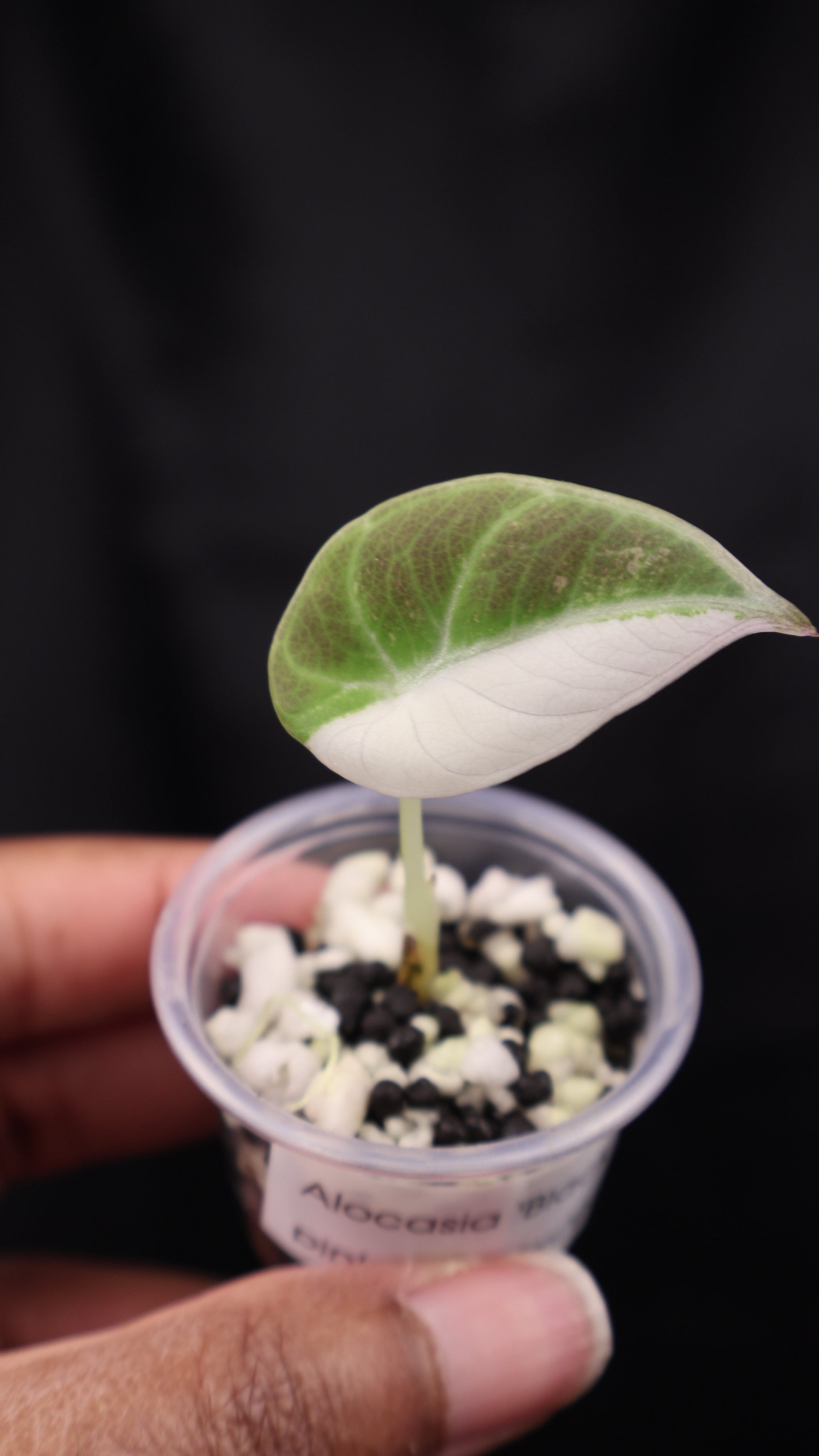 An Alocasia Black Velvet pink albo featuring its signature dark, velvety leaves contrasted with pastel pink variegation. The pink colouration becomes more prominent with maturity. This compact variety is prized for its dramatic colour contrast. A staple addition for any variegated Alocasia collector.