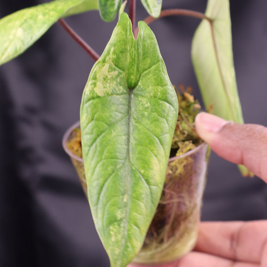 A striking, compact alocasia known for its elongated, textured leaves. This aurea form features tricolour variegation displaying shades of green, yellow, and cream for a truly unique appearance.