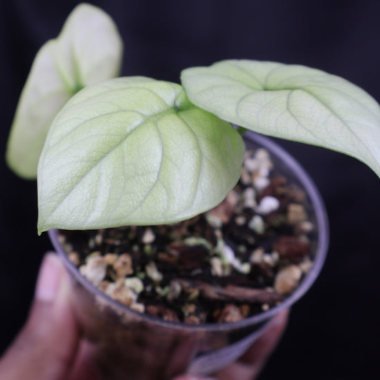 A beautifully compact alocasia known for its glossy, quilted leaves and soft mint variegation.