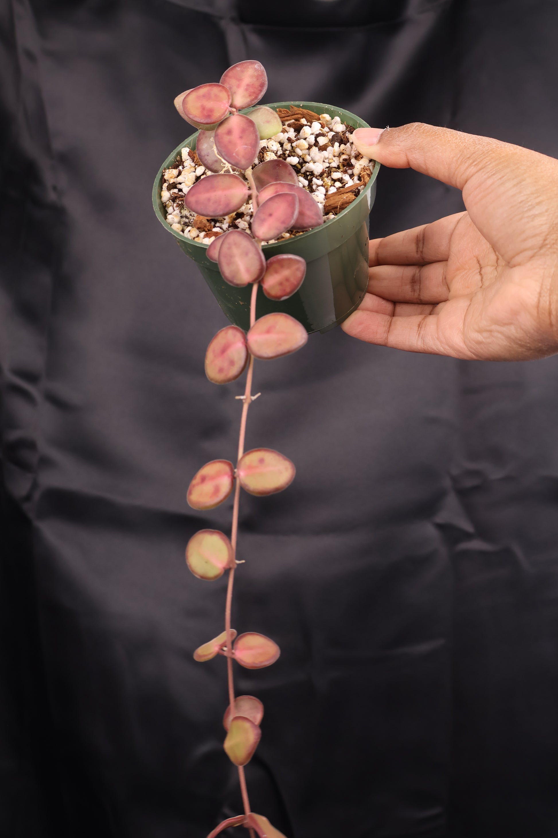 A hardy, trailing Hoya with soft, fuzzy leaves and red-tinged edges under bright light. Known for its cascading growth habit and sweetly scented blooms.
